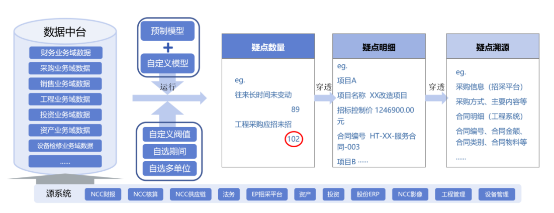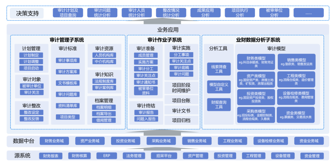 深度融合集团核心业务、财务系统数据。基于已梳理的数据资产,从审计视角出发,串联跨系统、跨业务的数据链条,实现高效的数据获取、清洗与关联分析,构建业务、财务数据全级次、跨周期审计覆盖网。