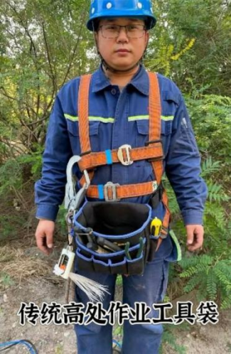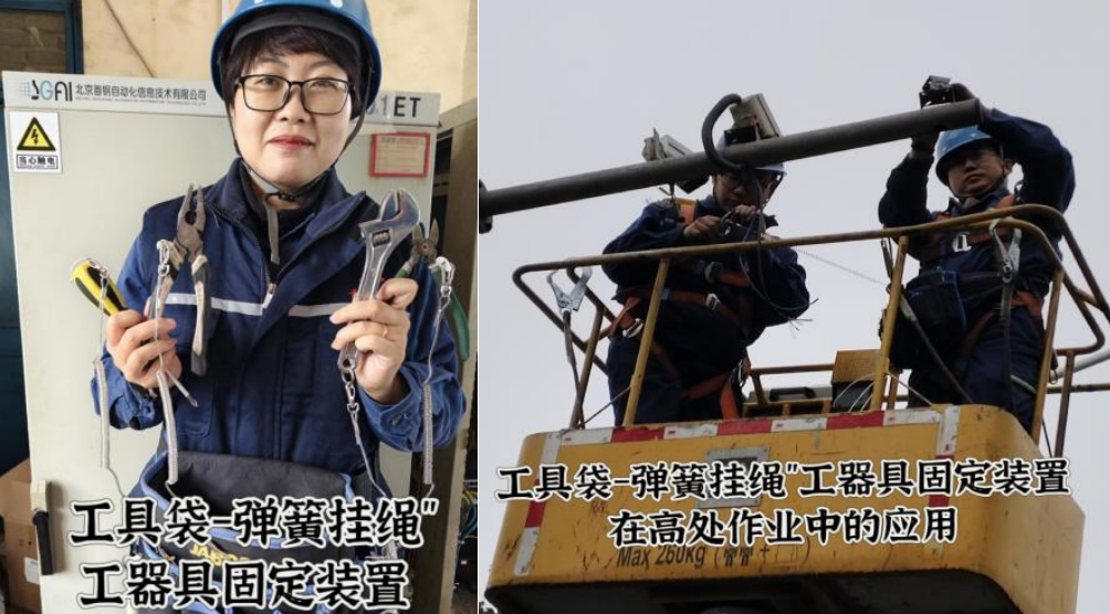首自信一线团队聚焦“源头防控”理念,研发了“工具袋--弹簧挂绳”工器具固定装置。该装置采用高弹性弹簧挂绳与耐磨工具袋组合设计,具备三大核心优势:一是适配性强,弹性挂绳弹性强,可自由抻拽,满足不同高处作业场景下的工具取用需求;二是安全防护全面,能有效防止工具在使用过程中坠落,从根本上消除物体打击风险,同时避免工具丢失;三是经济性突出,材料成本低、结实耐用,可实现批量制作与广泛推广。