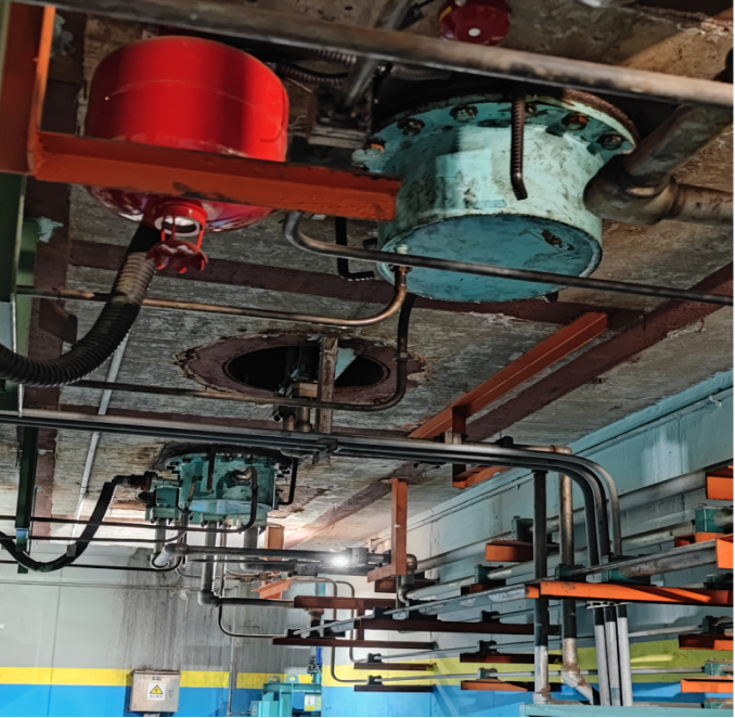 酸轧每年中修期间更换压上缸,压上缸内置磁尺套件,需要同步拆除磁尺接线。如果拆除磁尺接线,要将地下油库顶部防护罩拆下,防护罩距离地面超过2米且无作业平台,工作侧防护罩底部存在液压阀台。拆卸工作侧防护罩只能站在阀台附近作业,防护罩整体较重,需二位职工合力支撑,防护罩下落过程存在砸伤作业人员风险。